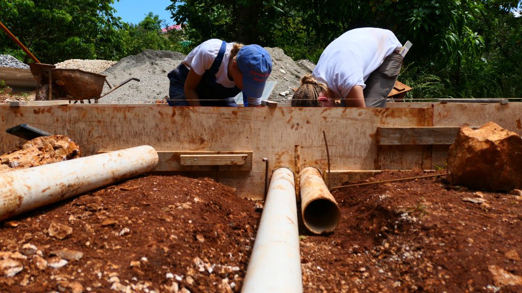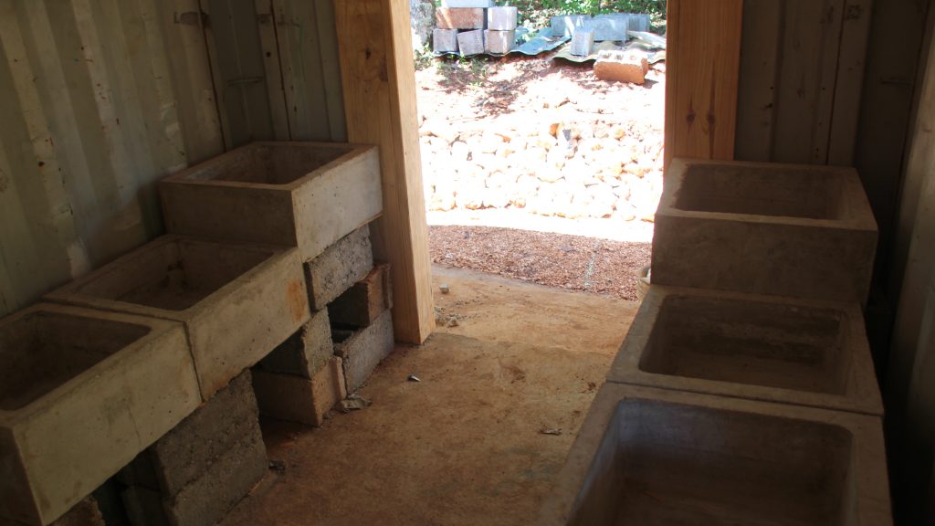 Parallel dazu ging der Ausbau der Kantine weiter: Frisch- und Abwasserleitungen, sowie Stromkabel wurden verlegt, Regenrinnen und Türrahmen zurechtgesägt und angebracht. Mit einer zusätzlich vor dem Eingang der Kantine betonierten Abflussrinne ist die Oberflächenentwässerung nun sichergestellt. Alle paar Tage durften sich ein paar Teammitglieder mit der Betonage von Betonwaschbecken für den Essensbereich beschäftigen. Dort sollen sich die Kinder die Hände waschen und nach dem Essen ihr Geschirr spülen können. Jeder versuchte diese Aufgabe zu umgehen, da wir bei der Planung das Gewicht klar unterschätzt haben.
