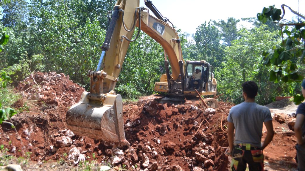Als nächstes stand der Spatenstich der zwei Zisternen an. Dieses Herzstück der Wasserversorgung, das nach Fertigstellung insgesamt bis zu 150 000 Liter Wasser fassen kann, soll zum Großteil im Boden verschwinden. Dafür durften wir uns schon zuvor in Deutschland die Frage stellen, wie man 400 Kubikmeter Erde und Felsbrocken ausgräbt und von dem Schulgelände abtransportiert. Nach vielen Überlegungen haben wir uns für einen 22 Tonnen schweren Bagger entschieden, der diese Aufgabe bewältigen soll. Über die vergangenen Bauphasen haben wir festgestellt, dass trotz noch so genauer Planung nie alles so läuft, wie angenommen. Das ist nicht unbedingt schlecht, denn so durfte sich Team 8.1 über eine sogar 35 Tonnen schwere Maschine freuen, die das gigantische Loch innerhalb weniger Tage problemlos aushob.
