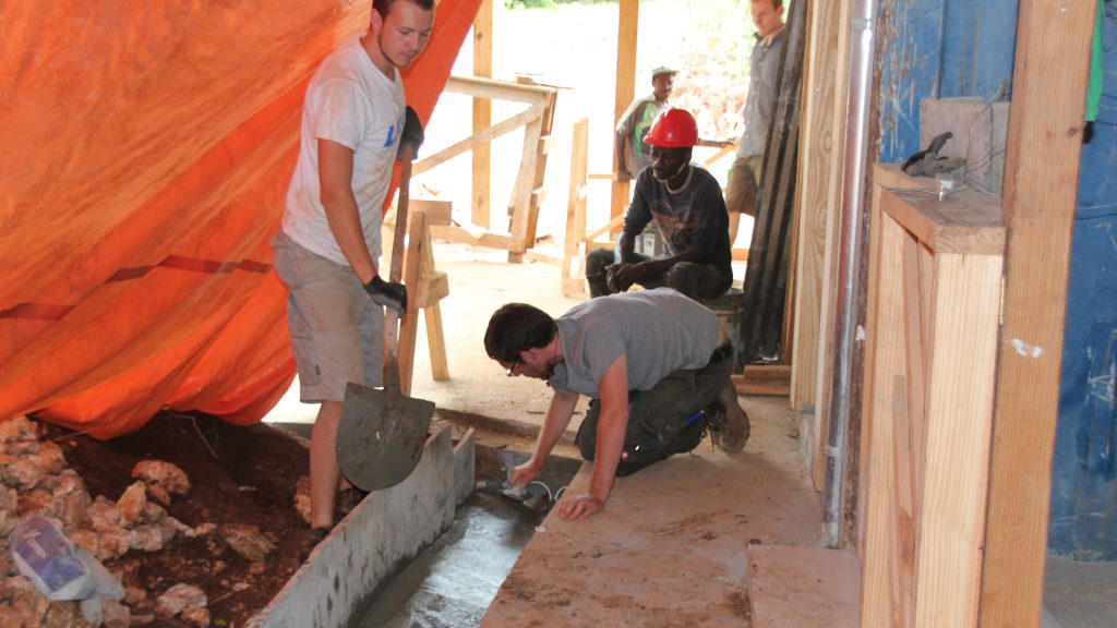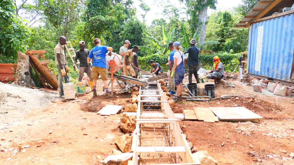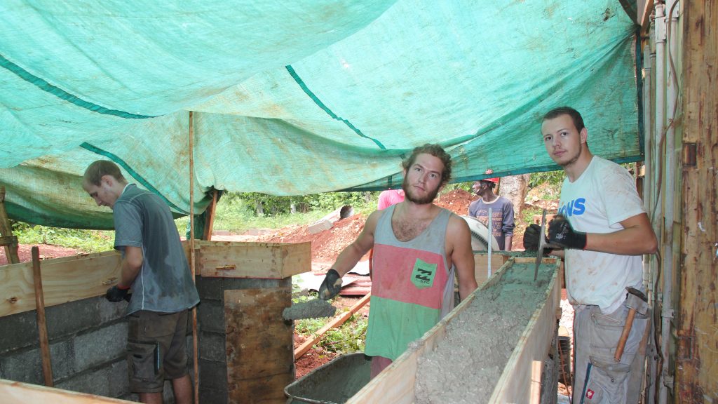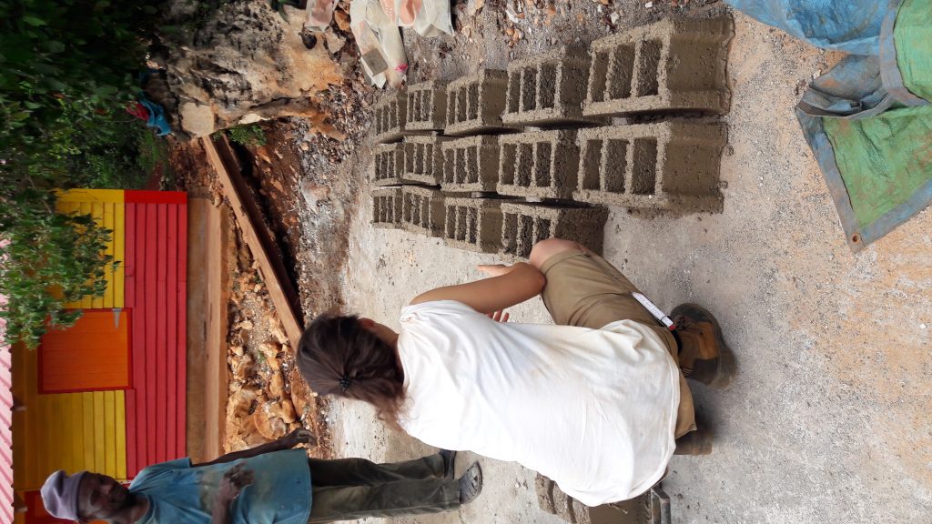 Dabei gab es für uns außer Zuschauen wenig zu tun, deshalb widmeten wir uns anderen offenen Aufgaben. Für das anstehende Gashäuschen stellten wir die für haitianische Häuser typischen Mauersteine her. Diese gossen wir mithilfe lokaler Maurer direkt auf der Baustelle in eine Form und ließen sie anschließend auf dem mittlerweile fertigen Fundament des Essensbereichs trocknen. Nachdem wir unzählige, aus verschiedenen Mischungsentwürfen hergestellte Mauersteine auf Stabilität getestet hatten, konnte die Massenproduktion beginnen.