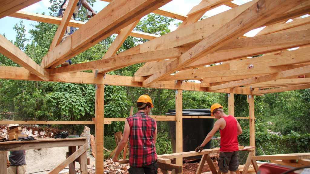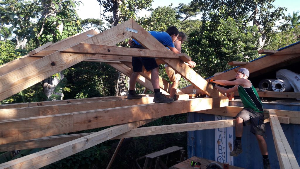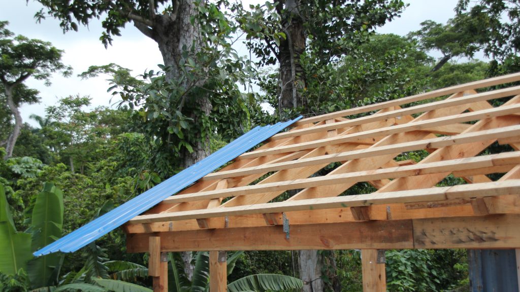 Mit der Anreise des zweiten Teams Anfang September nahmen wir den Bau des Essensbereichs in Angriff. Ungefähr 1700 Schrauben und Nägel sollten den insgesamt 2,7 Tonnen schweren Holzaufbau am Ende zusammenhalten. Zwei Wochen lang liefen alle Sägen und Akkuschrauber auf Hochtouren, bis wir schließlich die Dachbinder auf die Stützen gehievt und mit Dachlatten verbunden hatten. Die Herausforderung lag aber noch vor uns, da wir das Dach des Essensbereichs mit dem Dach der senkrecht dazu stehenden Kantine verbinden wollten: Nachdem alles mindestens dreimal nachgemessen und mit mehreren Winkeln in verschiedene Richtungen nachgesägt wurde, lernten wir immerhin die Werkzeuge besonders genau kennen.