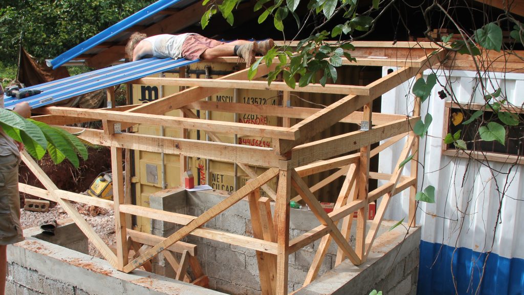 Durch akrobatische Höchstleistungen war nach kurzer Zeit ein Wellblechdach auf dem hölzernen Essensbereich befestigt und nach ein paar Korrekturen, sogar ordentlich abgedichtet. Weiter ging es mit dem Gashäuschen. Dafür probierten wir eine neue Bauweise aus. Auf die Anschlussbewehrung des Fundaments wurden schichtweise Mauersteine aufgefädelt, anschließend mit Beton aufgefüllt und mit Bewehrungsstahl verstärkt. Zwar scheint dies relativ aufwendig für so ein kleines Gebäude, aber Sicherheit geht vor. Anschließend verpassten wir dem Gashäuschen einen Holzaufbau.