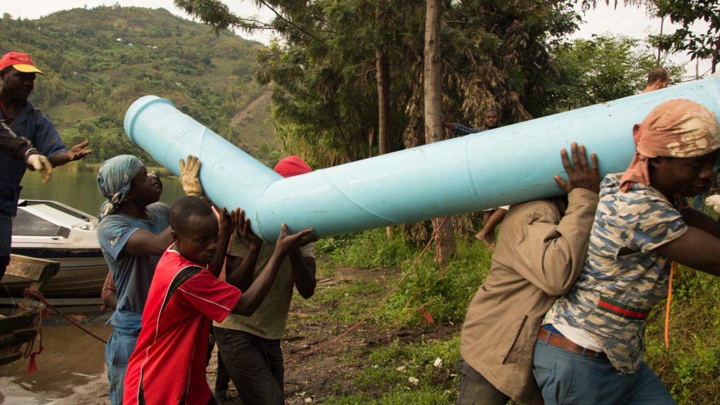 Dienstag 17:00 – Den Tag habe ich in einem Hotelzimmer in Bukavu verbracht. Ich schnappe ein paar Unterhaltungen auf – es muss wohl ein Treffen mit dem Projektpartner ECP gegeben haben. Nun geht es weiter Richtung Fährhafen, mit viel Hupen und wenig Tempo durch den Feierabendverkehr von Bukavu. Im Hafen werde ich wieder mal auf die Schulter gewuchtet und auf eine kleine Fähre getragen. Im Abteil stehen sehr gemütlich aussehende Sofas, auf denen sich die Fahrgäste einrichten. Antoine und Johannes scheinen sich gut mit einem jungen Kongolesen zu verstehen und schon bald werde ich als Kartentisch benutzt. Es wird wohl wieder eine längere Fahrt…