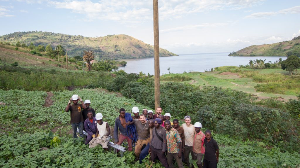 Nach diesem Intermezzo konnten die Arbeiten an den Masten nun weitergehen. Doch schon wieder stellt uns das schwere Gewicht von bis zu 400kg vor eine Herausforderung: Wie transportiert man diese nun hunderte Meter über bergiges und unwegsames Gelände? Ganz zu schweigen davon, wie man sie letztendlich aufstellt. Nach vielem Kopfzerbrechen durften wir feststellen, dass das hier ganz einfach mit vielen Männern, kongolesischer Tragetechnik und Motivationsrufen funktioniert. Es dauert zwar lange, es muss oft abgesetzt und Pause gemacht werden, aber schließlich findet jeder Mast sein Ziel.
