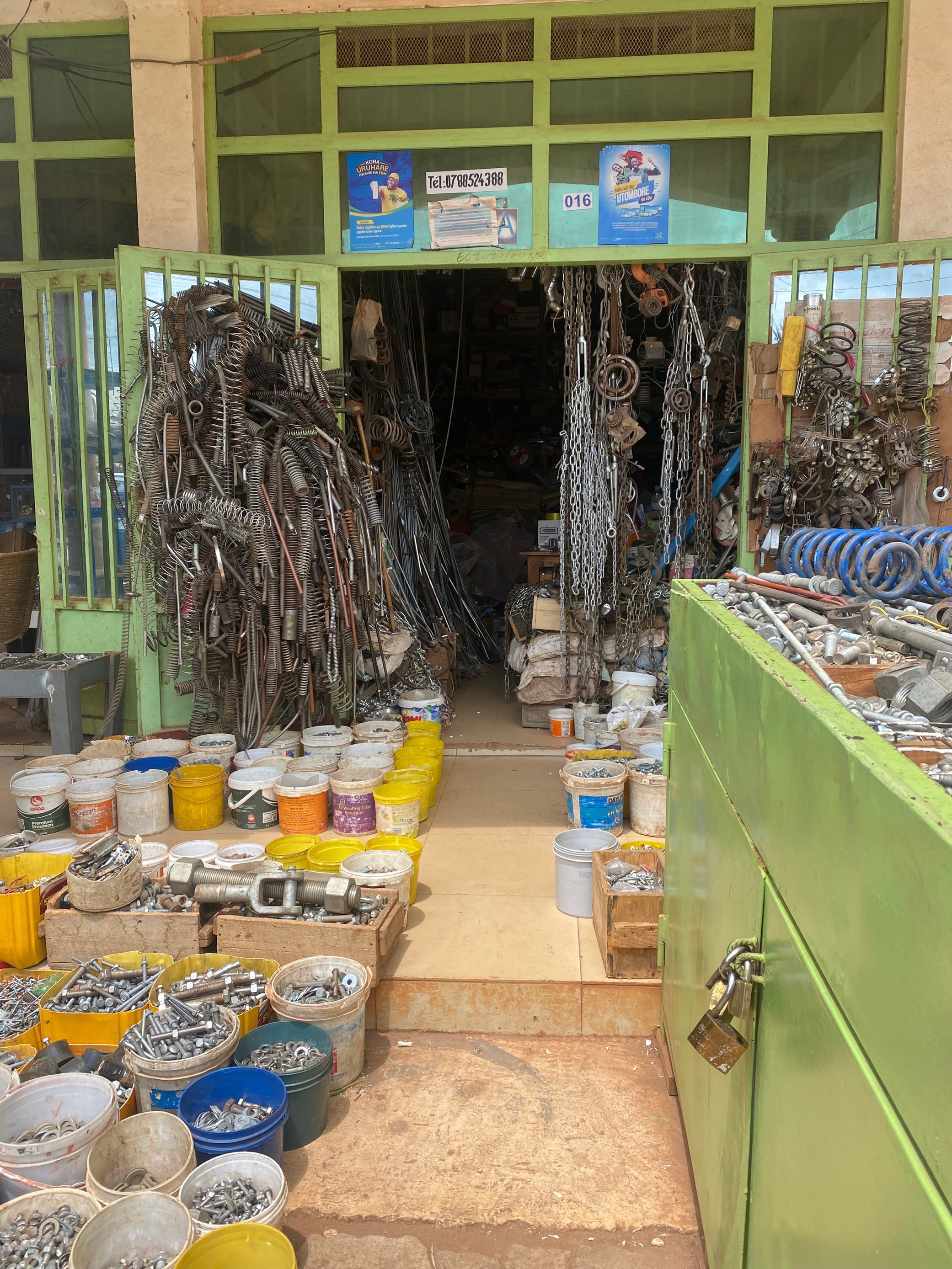 Nachdem die Einkaufsliste fertig geschrieben, übersetzt und mit Bildern versehen war, klapperten wir jegliche Fachgeschäfte für Werkzeug, Metallverarbeitung und Baumaterialien ab. Dazu gehört auch der Gancinjiro Markt, der im Grunde eine Ansammlung aus ganz vielen Mini-Baumärkten ist. Zuerst machten wir einen Preisvergleich der verschiedenen Läden und Händler*innen, um anschließend mit Unterstützung von Jérôme, der bei unserer Partnerorganisation PROLASA angestellt ist, alles einzukaufen.
