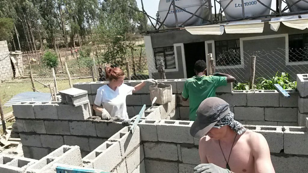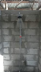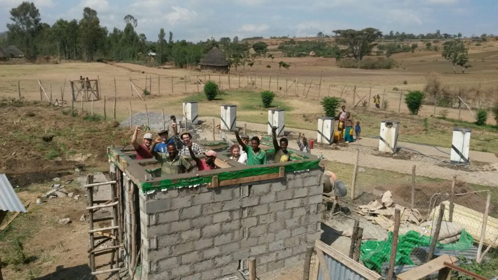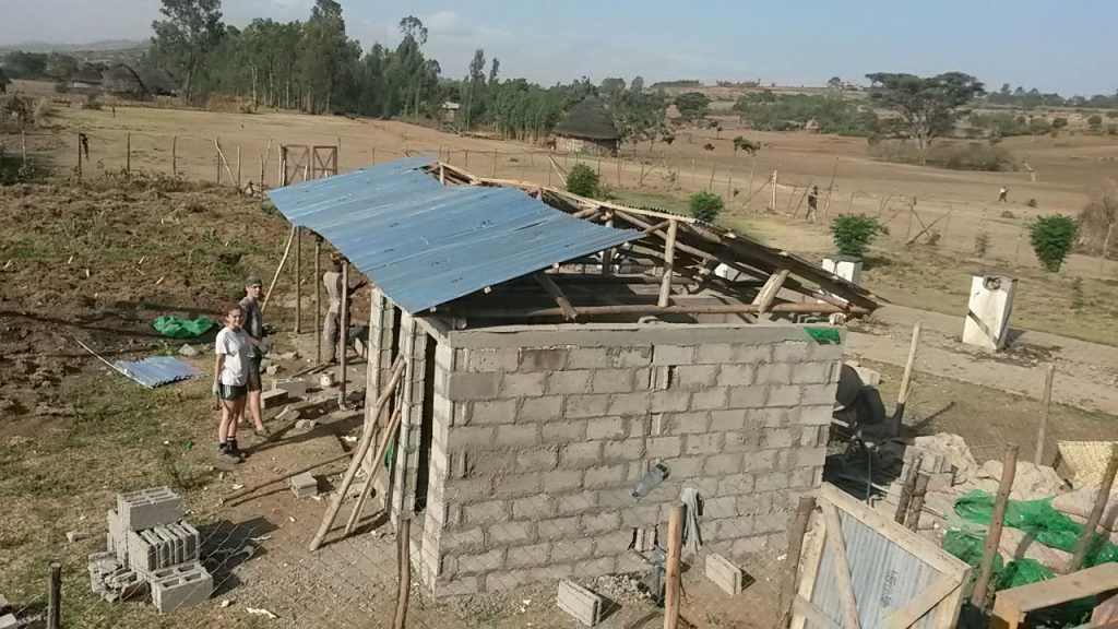 Glorious Friday entlohnte dann die Strapazen der letzten Tage. Angetrieben von selbst gemachtem äthiopischem Kaffee ging es direkt zur Sache. Unter ohrenbetäubendem Lärm nagelte das Dachteam ruckzuck die Wellblechplatten auf den Dachstuhl, war dabei jedoch etwas freigiebig mit den begrenzten Nägeln, weshalb noch vor der Mittagspause ein Baustopp eingelegt wurde. Aber das Dach konnte man als fertig betrachten. Währenddessen nahmen Lukas H. und Jan die zweite Hälfte der Rohre in Angriff: raus geschraubt, Teflon drauf, wieder rein und Drucktest. Das ging wieder nur langsam vorwärts, aber immerhin. Die Frühstückspause mit leckeren Biscuits (ja, sie schmecken jeden Tag so gut wie am Anfang, ganz ehrlich!) gab neue Energie, bis Mittags waren alle Rohre bis zu den Waschtischen dicht, alle mit Schellen an der Wand befestigt und zwei Duschen schon einsatzbereit.